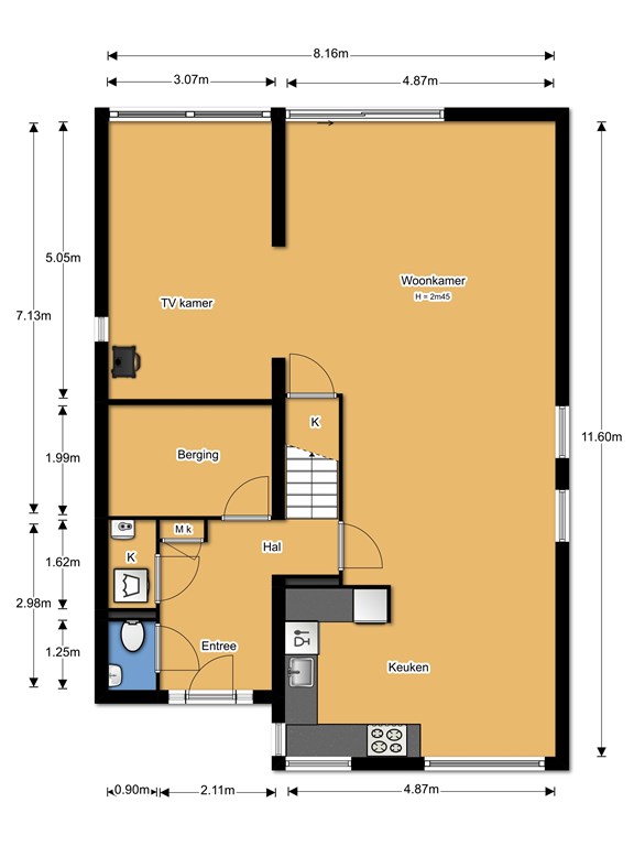 • Ruime hal met meterkast, trap naar de 1e verdieping en toegang naar de woonkamer;