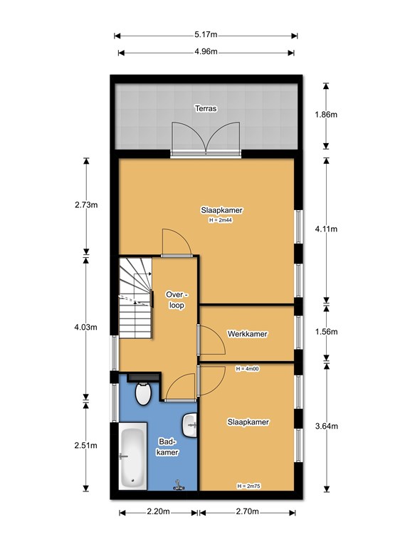 • In de werkkamer (2.70 x 1.56 m) is ruimte voor een bureau, deze ruimte heeft een hoog plafond (veelal wordt hier een plafond gemaakt voor extra bergruimte, die via de zolder dan bereikbaar is);