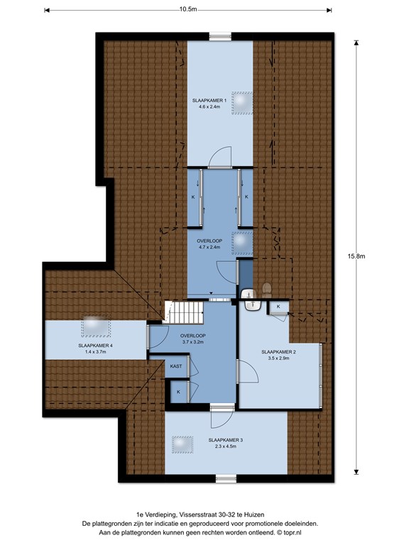 Op de beide overlopen zijn kasten aangebracht. In de kamers zelf is, waar mogelijk, achter de knieschotten bergruimte. Op deze verdieping bevindt zich ook een toilet met wastafelmeubel.